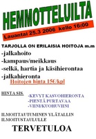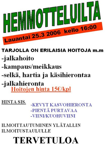 Lille järjestää kotonaan hemmotteluillan Lauantaina 25.3 2006. Hemmotteluilta alkaa kello 16:00. Hemmotteluillassa on tarjolla erilaisia hoitoja kuten jalkahoito, kampaus/meikkaus,jalkahieronta,selkä-,hartia- ja käsihieronta. Hoidot maksavat 15€/kpl ja hintaan sisältyy kevyt kasvohieronta ja pientä purtavaa viinin/kuohuviinin kera. Voit ilmoittautua hemmotteluiltaan ylätallin ilmoittautumislistaan. Lilleltä voit kysyä hoidoista lisää. |