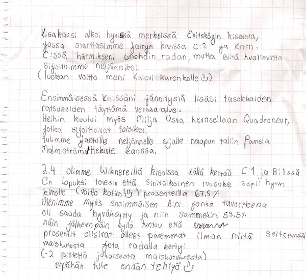 Tarpeeksi kun patistaa niin alkaa syntyä tulosta. Innokkaan nettisurffailun tuloksena sain selvitettyä TAMPAn jäsenten kisaamisesta alkukaudella. Kun sitten pyytämällä pyyteli kisaraportteja niin yllättäen "toimitukseemme" saapui kirje jossa raportti useammasta kisasta. Kisoissa ollut ratsukko on Sofie Siivola hevosellaan Fairy de Garenne. Seuraavassa tarkasti kaikki mitä kirjelappusessa luki: "Kisakausi alkoi hyvissä merkeissä Evitskogin kisoista, jossa starttasimmeFairyn kanssa C:2 ja KN:n. C;ssä harmikseni unohdin radan,mutta siitä huolimatta sijoituimme neljänsiksi. Luokan voitto meni Kalevi Karenkolle. Sen lisäksi että Sofie on innostunut kisaamaan niin on TAMPA saamassa yhden tähtitoimittajan lisää. Sofiesta kuulemme vielä paljon tällä kaudella. |