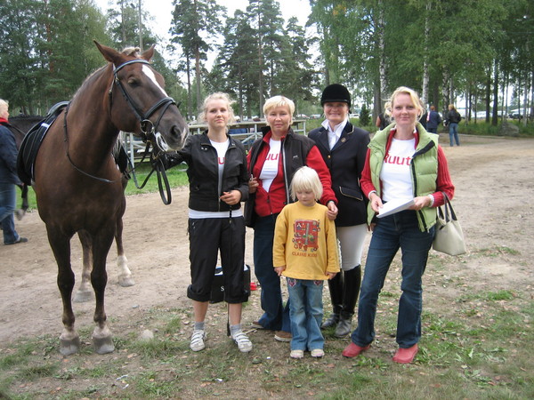 ”Hevosessa on poweria!” Lainasin otsikoksi koulutuomarilta saamaamme loppukommenttia :-). Suomenratsujen kuninkaalliset järjestetään kolmipäiväisinä sisältäen sekä este-, koulu-, valjakkokilpailut että laatuarvostelut 3-, 4- ja 5-vuotiaille. Me osallistuimme heti perjantaina koululuokkaan Helppo A:2. Tulos rikkeistä huolimatta 59,3 % ja sijoituimme 8. (luokkaan osallistui 38 ratsukkoa, mutta kärkinimet puuttuivat). Lauantaina olikin sitten tosi toimien aika eli Suomenmestaruusluokan 1. osakilpailu (karsinta finaaliin) helppo A:0. Olimme saaneet kvaalit osallistua 1. osakilpailuun Vesijärven ja Lohjan kansallisissa kisoissa. Ruudulla oli muuten paikalla HIENO fani-joukko : ) (kuten kuvasta näet - valitettavasti kaikki fanit eivät ehtineet kuvaan). Upeasta kannustuksesta (kiitos Karkki, Tuula, Hämme, Sessa, Saija, Outi, koirat…), hyvistä lainavarusteista (kiitos Tupu ja Tiina) ja erittäin tehokkaasta kotivalmennuksesta & -ratsastuksesta (kiitos Nuppu ja Karkki) huolimatta emme yltäneet (vielä ;-)) kuin 30. sijaan 36 ratsukosta. Prosentit 55,6 %. Mutta oli hieno olla mukana ja tavoite kuitenkin saavutettiin. Sunnuntaina osallistuimme vielä lohdutusfinaaliin Helppo B FEI kenttäkilpailuohjelma poneille 1993. Fiilis ei ollut ihan yhtä hyvä verryttelyssä kuin aikaisempina päivinä (olimmeko jo väsyneet kolmen päivän jälkeen?), mutta kun kiersimme kouluradan juuri ennen rataani, niin huomasin, että Ruutu on valmis käyttämään sitä poweria vielä kerran ja niin lähdimme suorittamaan hienoa rataa. Radalla oli hienoa ”esiintyä” ja olin tyytyväinen ratamme jälkeen. Sitten sitä vaan odoteltiin tuloksia ja saimmekin 62,2 %!! Kun 14 ratsukkoa oli suorittanut, olimme vielä kiinni viimeisessä palkintosijassa (Johanna Haimin – Taika Akselin ja Hanna-Leena Räsänen - Vivan Vietsaus kanssa), mutta yksi ratsukko, Helkky Pakarinen ja Pilkun Pilke, meni sitten loppusuoralla ohi (63,8 %). Olimme lopputuloksissa siis 6./18. Jos kommelluksista pitää kertoa, niin mainittakoon, että jouduimme kiertämään perjantaina melkein takaisin tallille, että pääsimme eri reittiä kisa-alueelle, koska alkuperäiselle reitille sattui erittäin pelottava työmaa (uuden valjakkomaneesin) ja näimme silloinkin sitä Ruudun poweria ;-). No, onneksi olimme ajoissa liikkeellä, joten kiertoreitti ei aiheuttanut ongelmia ;-).