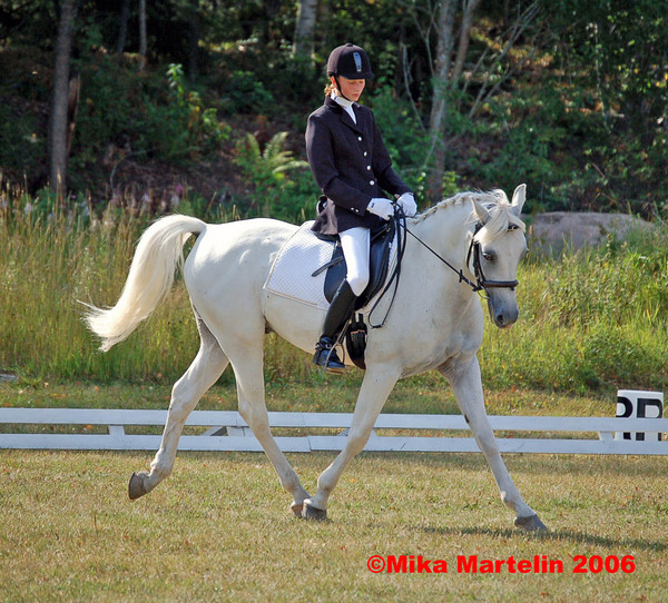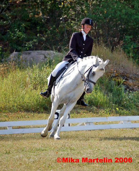 TAMPAn janet Johanssonin tahti sen paranee sitä mukaa kun kausi alkaa loppua....raportti Luoman seurakoulukilpailuista. Jos kerran Kaisa on sanonut, että kisaraportti on jokaisen TAMPAlaisen kisaajan velvollisuus, niin tässä sitä nyt tulee! :Eli sunnuntaina 8.10 lähdettiin Luomaan (ProEquo). Meidän luokkaan (KN:Special) oli ilmoittautunut 22 ratsukkoa joten asetin tavoitteekseni mahdollisimman hyvän radan ratsastuksen välittämättä sijoituksesta. "Parkkis" osoittautui ekaksi ongelmaksi ; vähintään 30 centin paksuinen mutaliejukenttä, ja auto traikun kera ei edes meinannut mahtua porttiaukosta sisään! Hetken kokeilun jälkeen pääsimme kuitenkin läpi. Sitten tuli eteen ongelma numero 2 : miten vaihtaa kisakamppet sekä hevoselle että itselle (varsinkin nahkasaappaiden tilanne huolestutti..) kellahtamatta kuraan..mutta onnistuipa sekin! :) Ja viimeisempänä muttei suinkaan vähäisempänä ongelmana nousi eteeni jännittyneen hevosen rennoksi ratsastaminen..se nyt ei täysin onnistunutkaan..Katsellessani joitain liitokavioita verkassa itsetunto ei täysin noussut..mutta kun aika radan ratsastukselle tuli, olin päättänyt tehdä vaikutuksen tuomariin ; ja niin näköjään tein! 65% tasan ja sijoitus 2/20 (ilmeisesti jotkut ratsukot olivat jääneet pois..)! :) Ja tällä kertaa kunniakierrosta laukatessa hepon pää pysyi kuin pysyikin alhalla! :D Täysin tyytyväisenä matkattiin kotiin - kylläkin yltäpäältä kurassa - valmistautumaan jälleen seuraaviin kisohin.. T. Janet ja Asil (teksti: Janet Johansson) |