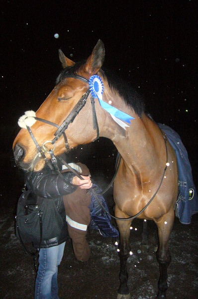 Hyvillä suorituksilla (voittokin). Lue raportit täältä.... Heippa! Oltiin 15.3 Tuomarinkylässä este-kisoissa Minä(Linda)Rigalla ja Annu Ellillä. Mentiin molemmat 90cm ja 100cm. Kisamatka alko ihan hyvin, Elli meni hienosti ekalla kerralla koppiin ja Rigan lastaus kesti VAIN puoli tuntia, jes! :-D Oltiin hyvissä ajoin tuomarinkylässä, jonka ansiosta saatiin rauhassa kattella muiden ratoja ja sumplia, että mitä ite tehtäis missäkin kohdassa. Meillä molemmilla oli lähtö vasta 90cm loppupäässä, itseasiassa oltiin peräkanaan (minä 22 ja annu 23). Riga tuntu verkassa aika laiskalta, kun taas Elli tais olla aika hyvä, mutta kuitenkin aika hermostunut. No rata alko ihan hyvin, mutta sitten kutosesteelle tuli erikoinen hyppy, jolloin multa lähti molemmat jalustimet! Olin sitten sen verran "ahne", että en viitsiny pysäyttää, joten jatkoin radan loppuun ilman jalkkareita. No en sitten saanu jalustimia uusinnassakaan, joten menin senkin ilman jalustimia pitäen lujasti harjasta kiinni! Jotenkin ihmeen kaupalla tuli kuitenkin 0-0! Annulla ja Ellillä 90 cm ei ollut (Annun sanojen mukaan) hyvä, Elli oli kuulemma tosi jännittynyt eikä edennyt, tempo oli kuulemma liian hidas ja yksi puomi putosi. 100 cm alkoi melkeen heti perään ja Annu meni heti ekojen joukossa (kolmantena), itte en nähnyt Annun rataan, mutta kuulemma oli paljon parempi ja tasasempi. Kuitenkin yhdellä okserilla Annu jäi liikaa suusta kiinni, jolloin Elli pudotti, harmittava pudotus!!! Annu oli kuitenkin tosi tyytyväinen, olihan nämä niiden ekat ulkopuoliset kisat! Kun itte pääsin radalle, niin Riga tuntu tosi hyvältä! Oli hyvä fiilis ja sillein. Rata meni hyvin ja tuli hienoja ilmavia hyppyjä, päästiin perusrata puhtaasti, joten päästiin uusintaan. En kovin paljoa lisänny tempoa, ehkä vähän reippaampaa laukkaa ja vähän pienemmät tiet, mutta ei mitään järkyttävää! Meillä siis 100 cm tuli taas 0-0 ja AIVAN yllätyksellinen voitto, JEE! ;-) Päivä sai kivan lopunkin, kun molemmat hepat meni hienosti koppiin, Rigankin lastaus kesti vaan 5 min! Ens viikonloppuna taas evitskogiin kisoihin, mutta nyt varmaan isommalla porukalla (?). Terkuin, Linda ------------------ Ja Koulukisoista: Ruskeasuon kansalliset koulukisat 16.3.08 Päätimme Roosan kanssa korkata kisakauden aloittamalla reippaasti kansallisista koulukisoista, luokkana he A:0. Ilmojen haltijat näyttivät jälleen muistavan meitä; lunta tuli tupaan edeltävänä yönä kuten viime vuonnakin! No, matkaan päästiin kuitenkin sujuvasti ja eväät hupenivat Päivin kanssa rattoisasti jutellen. Verkka-alueella olikin kunnon rodeota; ponit sinkoili edestakaisin ja yksi pilotti jopa päätyi maistelemaan Rusan vaseliinihiekkaa. Ei näyttänyt saavan Michelin-tähteä…. Roosa ei juurikaan hötkyillyt, oli vaan kovasti menossa, ja sama ”tuulipuku”-vaihde jatkui vielä maneesissakin. Radalle pääsimme aika hyvässä yhteisymmärryksessä ja tehtävät sujuivat melkoisen hyvin; peruutuksessa tuli jokin käsittämätön kommunikaatiokatkos ja siten liikkeestä kommentti ”vastustelee”, keskilaukassa yritettiin esittää hienoa siirtymistä keskilaukka-harjoituslaukka-harjoitusravi, joka päätyi siihen, että Roosa totesi kuskin haluavan käyntiin…. yritettiin sitten korjata parhaamme mukaan seuraavassa keskilaukassa! Lopputervehdyksessä saatiin suora hevonen ja täsmällinen pysähdys. Ja kuskilla leveä hymy! Koko esityksestä tuli 458 p ja 56,5 %. Tuomareina olivat Anders Sucksdorff (pj.), Marja Kivioja ja Johanna Höglund. Tästäpä on hyvä jatkaa kisakautta; kiitokset taas Pro Groomille Päiville! Tupulle kiitokset kannustuksesta ja erinäisistä muistutuksista (”piuhat!”)…. Ruskeasuolla järjestelyt toimivat taas erinomaisesti ja oli tosi mukavaa kisata! Ja Roosa on aivan ihana hevonen!