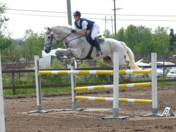 Lue täältä raportit ja ja katso kuvat! Raportti 1: Sunnuntai 25.5 T : Lilja,S-A & Peppi Raportti 2: Hellou, minä taas täällä rustailen raportteja :), ehkä joku jaksaa lukeakkin... Eilen (1.6) oli siis vuorossa Hyvinkään kisat, luokkia olikin laajalti aluekisoiksi, aamusta kisat alkoivat nimittäin 90cm luokalla ja iltapäivästä hypättiin vielä 130cm luokka. Heti aamusta lähtien oli selvää, että päivästä tulisi erittäin kuuma ja hikinen, niin hevosille, ratsastajille kuin myös hoitajille. Tampajalta ensimmäisenä oli tulessa Paula ja Rölli 90 cm luokassa, tuloksena oli yhden kiellon jälkeen 4 vp. Rölli oli helteestä hieman löysällä tuulella, mutta Paula jaksoi tsempata kuitenkin myös 100cm radalle, sieltäkin tuli tulokseksi tuo 4vp ja yksi okseri ylitettiin ravistakin, mutta siitä mentiin komeasti yli! 100cm starttasivat TAMPAlta myös Emma ja Mursu, Emma kuitenkin keskeytti suorituksensa, koska hevonen tuntui oudolta, Annu ja Elli, joilla tippui valitettavasti sarjan b osa, he olivat toinen ei sijoittunut ratsukko, sekä Laura ja Kaali, jotka tapansa mukaan nappasivat upean ja nopean radan päätteeksi rusetin, eli 4. sija tuli!! Hyvä Laura :) 110cm TAMPAlaisista osallistuivat allekirjoittaneen ja Kirpan lisäksi Laura ja Kaali, Annu ja Eliska ja Ninni ja Patrik. Ensimmäisenä meistä ratsasti Laura, Kaali taisi olla jo helteestä väsynyt ja tulokseksi tuli 8vp, saman kohtalon koki Annu ja Elli. Ninni ja Patrik kieräyttivät myös kaksi puomia alas, sinne myös 8vp. Meille taasen tulokseksi 4 vp, kun hepo ei tajunnut lähestyvänsä ensimäistä estettä, vaan kattelin maisemia ja puomihan kellahti sitten maahan... Sen verran vähän kuitenkin tuli nollia, että sijoituimme Kirpan kanssa 10. sijalle luokassa ja saimme siis mukaamme vihreän rusetin :)! 120cm porukka karsiutui niin, että vain me Kirpan kanssa ja Ninni ja Patrik starttasimme sen luokan. Ninni ja Patrik olivat muutama ratsukko ennen meitä lähtövuorossa, rata alkoi aivan erinomaisesti, mutta loppua kohden hevonen muuttui vissiin todella vahvaksi ja kaksi puomia kierähti kannattimiltaan. Kirppa lähti tällä kertaa paremmin liikkeelle ja ensimmäisistä kolmesta esteestä selvisimme kunnialla, sitten tuli tiukka käännös, jossa kuskilla oli jarrut hukassa ja hevonen meinasi hieman löysällä pohjalla käydä kyljellään, siitä sitten suoraan könyämään okserille, eihän siitä mitään tullut vaan olimme puomit sylissä keskellä okseria... Onneksi mitään ei käynyt ja rata jatkui, taas kolme estettä suoritettiin hyvin, kunnes piti ratsastaa diagonaali linjalle, kulmassa ennen linjaa, ei kuskin sisäpohje kuitenkaan oikein mennyt läpi, joten okserille tultiin poski edellä, eikä siitä kyllä sitten yli menty.... pilliin ei kuitenkaan puhallettu hylkäyksen merkiksi, vaikka omasta mielestäni oli tullut kaksi stoppia, joten jatkoin vielä viimeisetkin esteet radalta.... Tuloksia ei vielä tätä kirjottaessa ole kipassa, mutta on kyllä kiva nähdä, että onko meidän tulos hylätty vai 8vp!! voipi olla että tuomaristo katsoi sen mun keilailun ja palloilun vaan tiputukseksi (ja hölmöytenä?!), saas katsoa?! kyllä oli ratsastajalla hieman huulipyöreänä, että mitä tapahtuu :).... Noh, ensi viikonloppuna Laaksolle, toivottavasti selvästi hyväksytyllä suorituksella, 120cm on ilmoittautunut 105 ratsukkoa!!! Kisapoppoon puolesta, *Heidi |