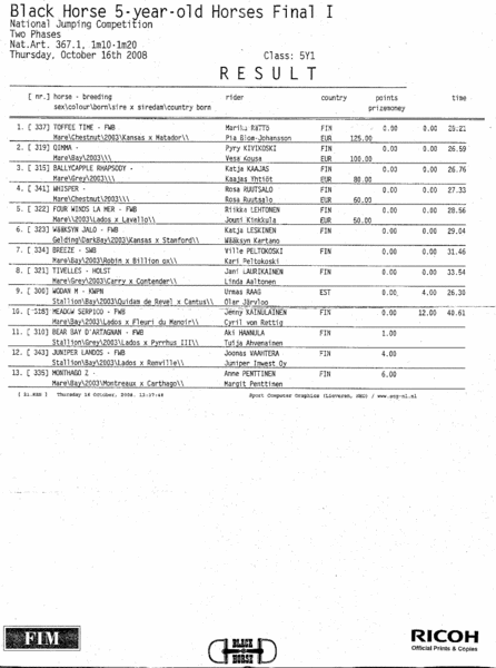 HUIPPUTULOKSIA Helsinki International Horse show:sta! Päivitetty: 20.10.2008 by Tofin porukka. Tuoreita tuloksia Hartwall Areenalta (torstai 16.10): Marika Rättö ja Toffee Time FWB (omistaja Pia Blom Johansson) voittivat Black Horse 5-Year-old Horses Final I 110cm-120cm luokan tuloksella 0-0 25,21. Luokkaan osallistui 13 ratsukkoa. Perjantai: Marika ja Toffee Time olivat seitsemänsiä 13 ratsukon joukossa finaali II:ssa (Black Horse 5-Year-old Horses Final II 110cm-120cm) 4 virhepisteellä. --- Ja Annina Nordström ja Auxine olivat hienosti neljänsiä Taitoluokan Finaalissa (110cm). Tuloksella 0vp ja 8 tyylipistettä! Finaaliin osallistui 10 ratsukkoa. Annina oli myös kuudes hevosellaan Narijke 7,4 tyylipisteellä. Onnittelut! Raportti: Hei! Ihanaa, että kisakausi on tällä erää ohi, ei tarvitse enää viikonloppuisin jännittää kentän laidalla Tofin ratoja.Tällä erää jännitys huipentui viime torstain ja perjantain nuorten hevosten luokkiin Helsinki Horse Showssa. Kun torstai aamulla saavuimme Hartwall Areenalle kävi Tofi todella kuumana tallialueella. Ajattelin, että mitäköhän tastä tulee, kun Tofi pääsee Areenan parrasvaloihin.... Mutta kun Marika meni selkään ja Tofi pääsi verryttelemään areenalle ei stressaamisesta ollut tietoakaan ja Tofi käyttäytyi erinomaisesti. Kun luokka alkoi ja Tofin aika oli tulla radalle oli lievästi sanoen aika jännittynyt olo. Marika luotsasi Tofin perusradalla hienosti nollatuloksella ja kun uusinta alkoi laittoi Marika "kakkosvaihteen" päälle ja Tofi vain lensi yli esteiden ja johtoon. Marika sanoi radalta tullessaan, että Tofi tuntui todella hyvältä radalla. Johtoasema piti luokan loppuun asti. Palkintojenjaossa tuntui uskomattomalta, että siellä se "meidän pikku pippurinen tammamme" seisoi Marikan kanssa voittajana HIHS loimi päällä. Enpä olisi uskonut, että tulee se päivä, että ensimmäinen oma kasvatti, jonka itse on peruskouluttanut (Nyyssösen Mirkan hienon sisäänratsastuksen ja alun jälkeen) osallistuisi HIHSiin ja vielä voittaisi siellä luokan! Muistan, kun Tofia ensimmäisiä kertoja 2-3 vuotiaana irohypytettiin Kaiden (Kaj Kronlund) avustuksella ja Kaide totesi, että hei "täähän osaa hypätä". Kaidelle kiitokset Tofin esteuran alkutaipaleelta! Marika on tehnyt hienoa työtä vieden Tofia viimeisen vuoden aikana upeasti eteenpäin ja ansaitsee siitä jätti kiitokset! Marikan ja Tofin yhteistyö tuntuu sujuvan hyvin ja saavutukset on sen mukaisia. Perjantaina oli toisen luokan vuoro HIHSissä. Tofi oli jostain syystä stressanut aika paljon yöpyessä jaba-boxissa Areenan pysäköintitiloissa; heinät oli poljettu ympäri karsinaa ja Prixitkään ei ollu oikein maistunu ja muutenkin se vaikutti levottomalta. Verryttely sujui kuitenkin hyvin ja ratakin sujui vain yhdellä harmittavalla kolmoissarjan viimeisen esteen pudotuksella. Tofi ei ollut radalla ihan yhtä terävänä kuin torstaina (ehkä väsynyt yöstä?), mutta hyppäsi kuitenkin hyvin. Tuloksena 7.s sija ja kokonaistuloksissa (torstain ja perjantain yhteenlaskettuna) sijalla 3! Nyt otetaan vähän taukoa hyppäämisestä ja Tofi saa välillä keskittyä opettelemaan koulukiemuroita talven aikana. Terv Pia BJ |